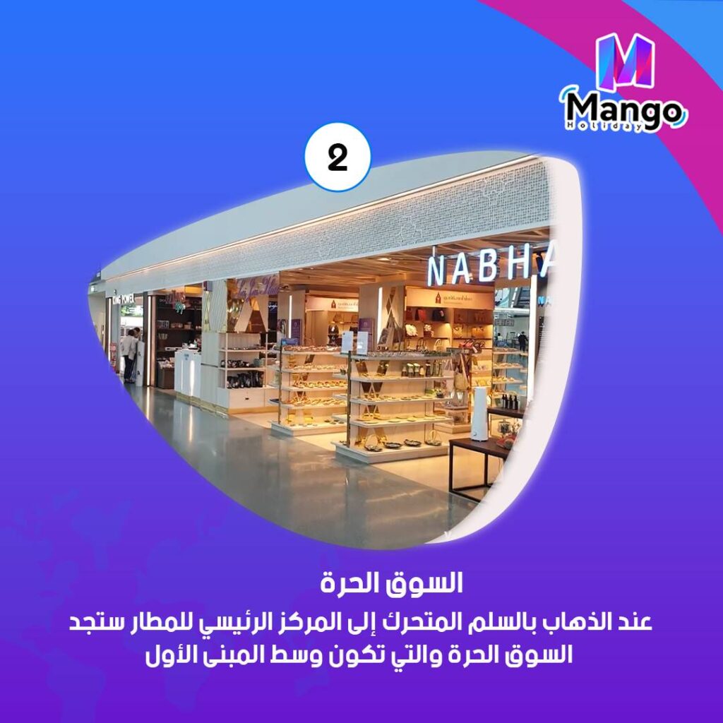 عند الذهاب بالسلم المتحرك الى المركز الرئيسي للمطار ستجد السوق الحرة التي يتواجد مولات لبيع المنتجات والماركات العالمية.