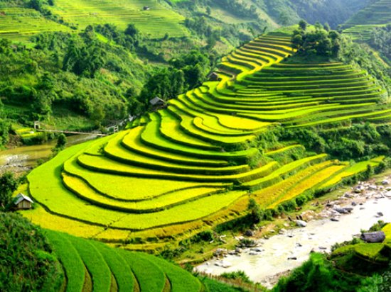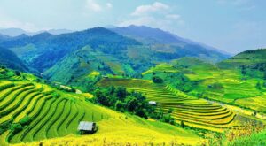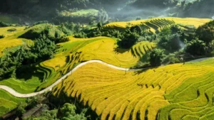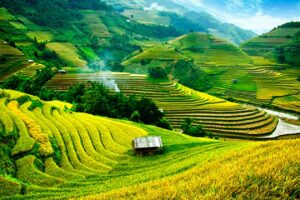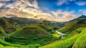 الحقول المدرجة التي تتدرج على سفوح الجبال، خاصة حقول الأرز، مما يعطي منظراً بانورامياً مذهلاً.