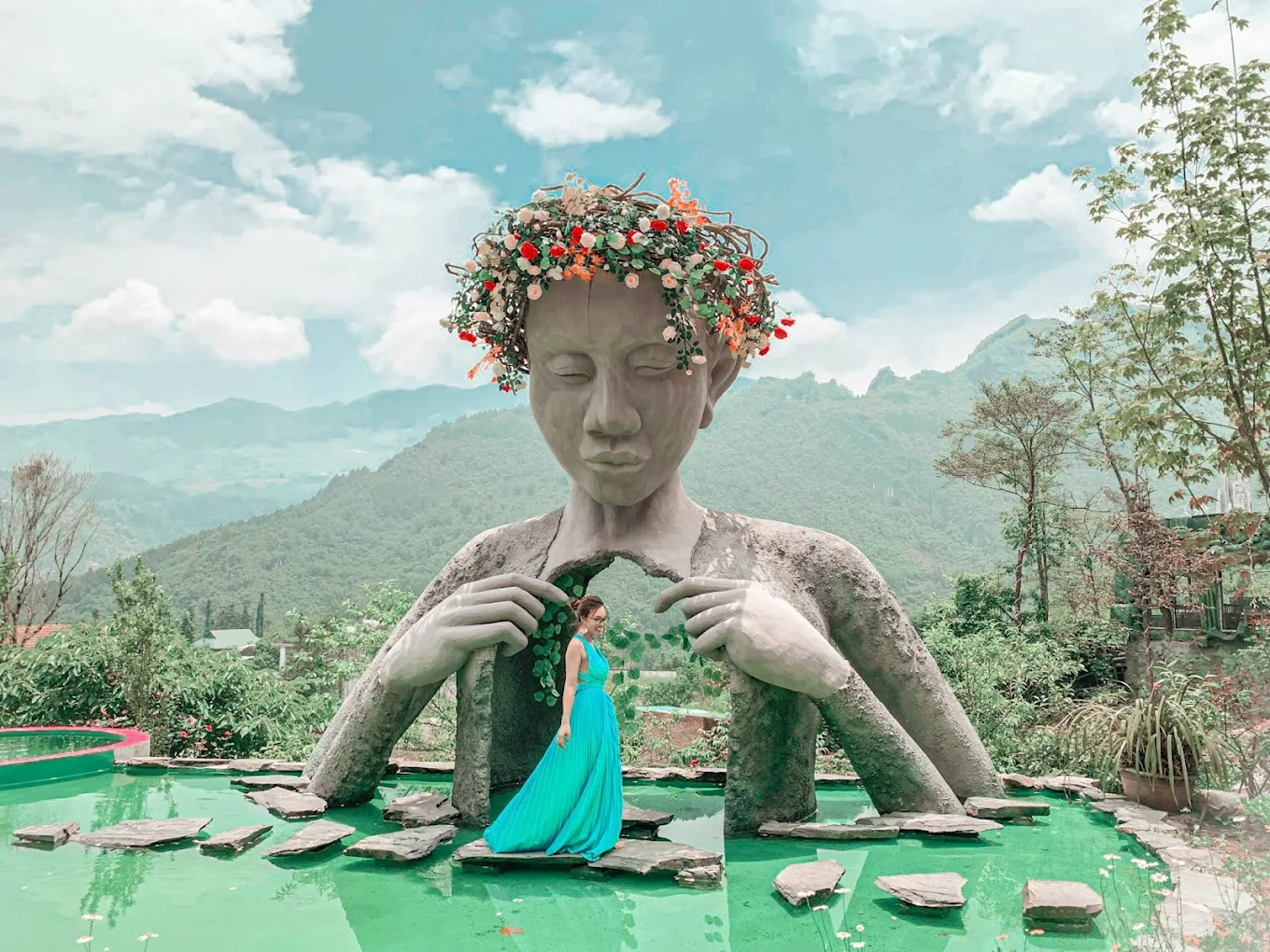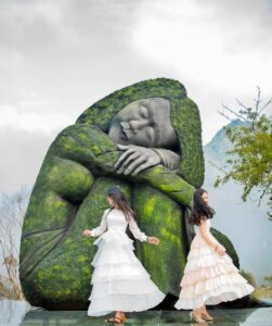 تمثال كبير يلفت الانتباه ويُعد من أشهر مناطق التصوير داخل Green Valley، مع الخلفية الخضراء والجبال.