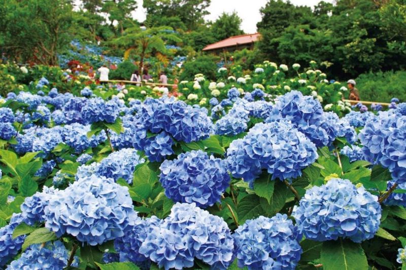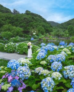 🌿 تمتد الحديقة على مساحة واسعة بين التلال الجبلية وتُغطّى بزهور الهيدرنجيا (Hydrangea) بألوانها المتغيرة من الأزرق إلى البنفسجي والوردي حسب نوع التربة والموسم.