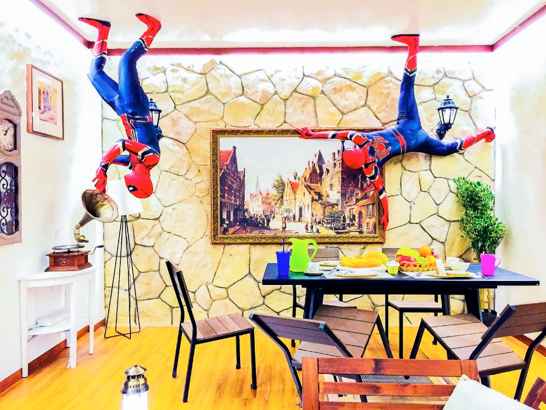 الغرف مفروشة بالكامل لكن الأثاث مثبت في السقف (سرير، طاولة، أدوات المطبخ، إلخ).