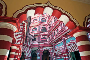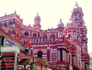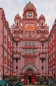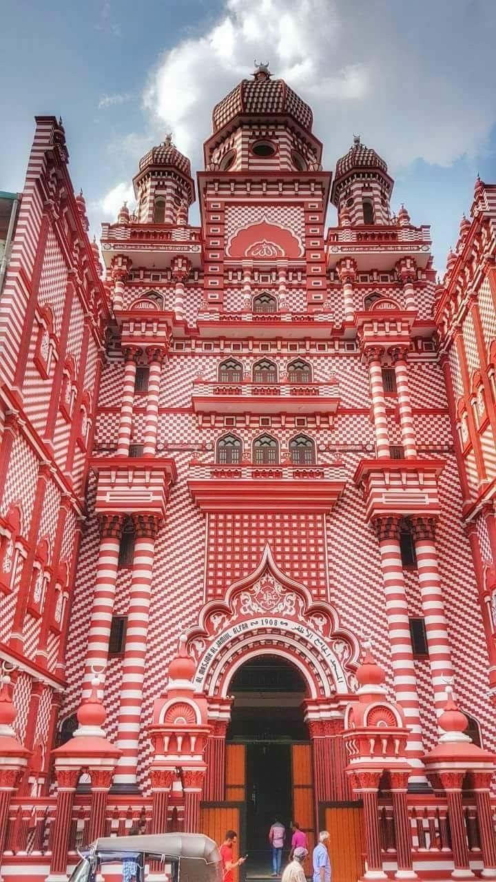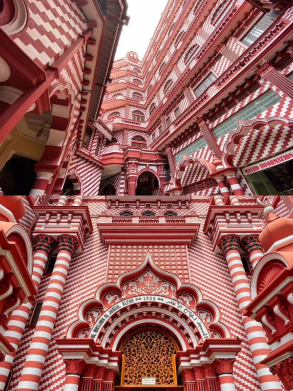 مسجد مشهور بلونه الأحمر والأبيض وتصميمه الفريد.