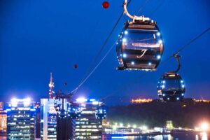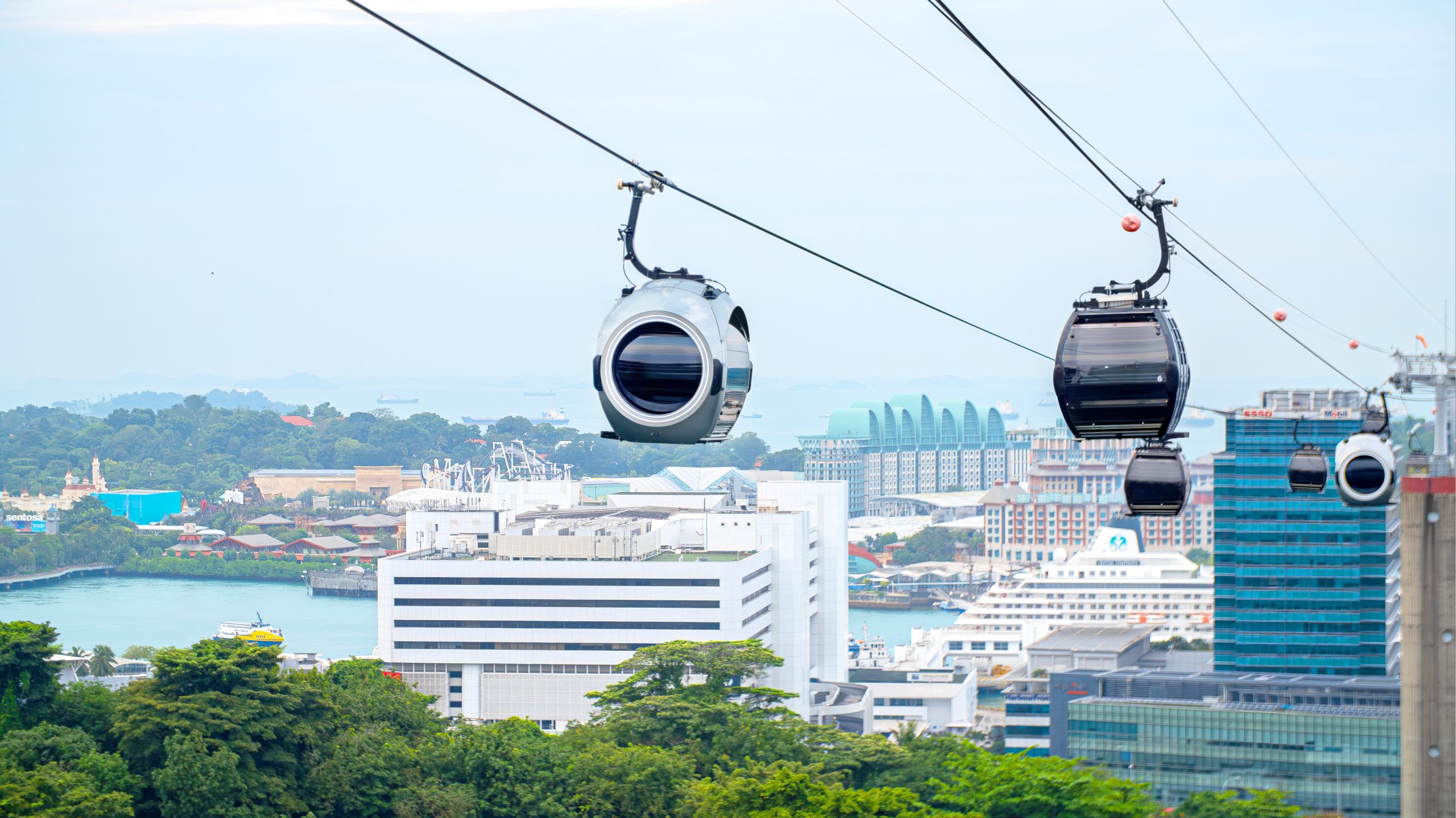 بعد ذلك، يمكنك ركوب التلفريك سنتوسا الذي يتيح لك مناظر بانورامية مذهلة من فوق جزيرة سنتوسا. رحلة التلفريك تعتبر من الأنشطة الممتعة التي تسمح لك برؤية معالم سنغافورة الشهيرة بما في ذلك الجزيرة والشواطئ والمناطق السياحية الأخرى.