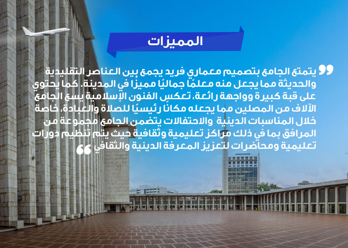 لا تنس زيارة جامع الاستقلال، الذي يُعتبر أكبر مسجد في إندونيسيا. يتميز بتصميمه الرائع ويعد رمزًا للوحدة الوطنية، ويعد مكانًا هامًا للزيارة لفهم العمارة الإسلامية في البلاد.