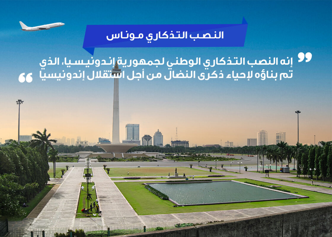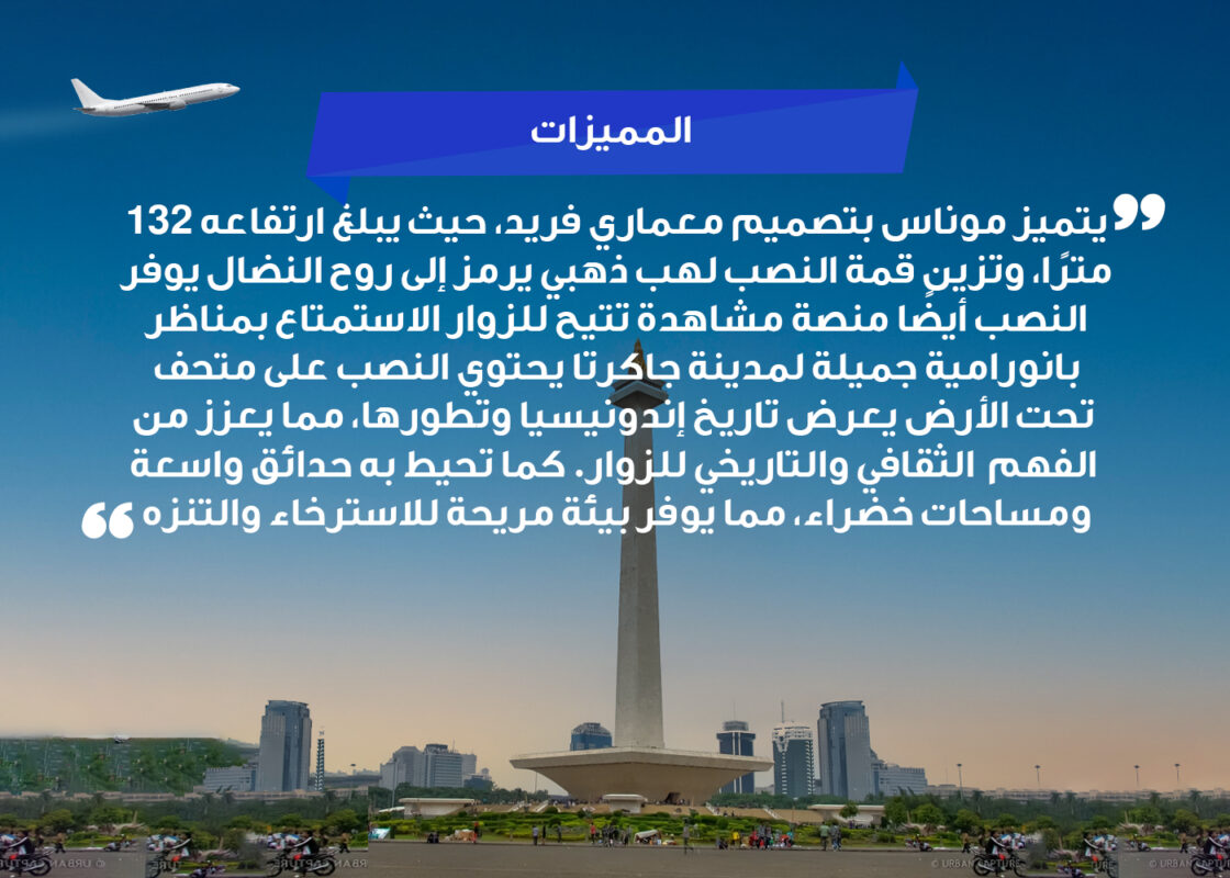 تبدأ جولتك بزيارة النصب التذكاري موناس، الذي يعد رمزًا للحرية والإستقلال في إندونيسيا. يمكنك زيارة القمة للاستمتاع بإطلالة رائعة على المدينة، واكتشاف المتحف الذي يروي تاريخ النضال الإندونيسي من أجل الاستقلال.
