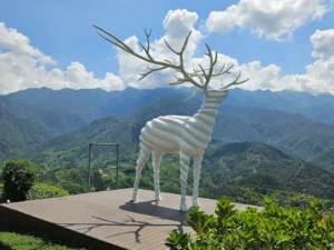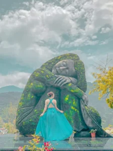 تمثال كبير يلفت الانتباه ويُعد من أشهر مناطق التصوير داخل Green Valley، مع الخلفية الخضراء والجبال.