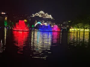 عندما تغرب الشمس وتضاء الأضواء حول البحيرة، يتحول المكان إلى أجواء ساحرة ورومانسية — ممتاز للصور المسائية والاسترخاء.