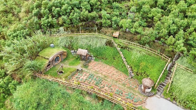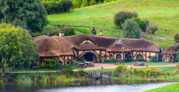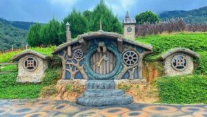 منازل ملونة بأبواب دائرية مميزة تشبه بيوت شخصيات الهوبيت، مناسبة لالتقاط صور رائعة.