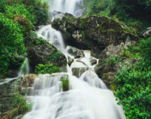 المنطقة المحيطة بالشلال مليئة بالغابات الجبلية، والهواء النقي، والمناظر التي تُذكّرك بروعة الطبيعة في عالي جبال Hoang Lien Son.