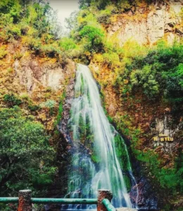 تشاهد مياه تتساقط بقوة تتلألأ تحت الشمس وتُشبه شريطاً فضياً وسط الصخور، مما يعطي إحساساً بـ الطبيعة الخام والسحرية.