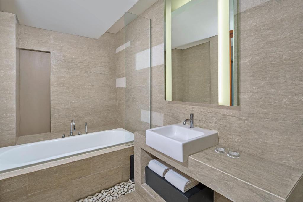 يتميز منتجع كورتيارد باي ماريوت بالي نوسا دوا ذو الـ 5 نجوم بمسبح كبير على شكل بحيرات شاطئية مع مناظر طبيعية ويحيط به كراسي استلقاء للتشمس ويضم مرافق للياقة البدنية على مدار الساعة طوال أيام الأسبوع ونادي شاطئ و5 أماكن لتناول الطعام، وتتوفر خدمة الواي فاي مجاناً في جميع المناطق، كما يمكن للضيوف الوصول إلى شاطئ نوسا دوا ذي الرمال البيضاء في غضون 15 دقيقة سيراً على الأقدام أو خلال 3 دقائق بخدمة النقل التي تتوفر مجاناً،