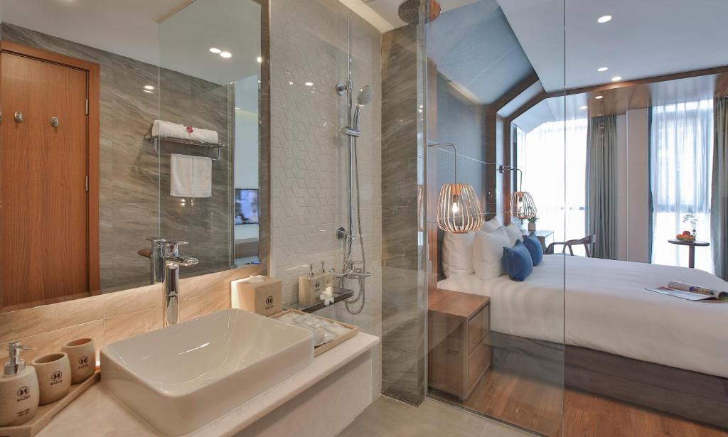 فيما يحتوي الحمام الداخلي الخاص على حوض استحمام أو دش ومجفف شعر ولوازم استحمام مجانية، وتتوفر أردية حمام ونعال لراحة الضيوف. يمكن للضيوف تناول وجبة طعام في المطعم الموجود في الموقع والذي يتميز بالمأكولات الشهية ابتداءً من المأكولات العالمية إلى المأكولات الفيتنامية التقليدية، كما يتوفر للضيوف صالة وبار Coffee أيضاً لاحتساء المشروبات.