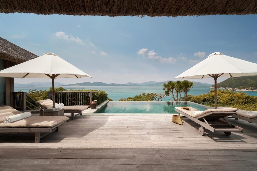 يقع Six Senses Ninh Van Bay في شبه جزيرة منعزلة، ويوفر إطلالات خلابة على خليج خاص تحيط به المناظر الطبيعية الجبلية المثيرة. يضم المنتجع 62 فيلا بحجم سخي، ولكل منها مسبح خاص به. وتشمل خيارات الفيلا تكوين واحد، واثنين، وثلاث غرف نوم، جنبا إلى جنب مع راحة الصخور الحصرية ومحمية المياه، والتي تشمل الانزلاق المائي. تم تجهيز كل فيلا بتراس واسع أو سطح السفينة ومناطق معيشة منفصلة وحمامات فاخرة كاملة مع غزارة مزدوجة ، سواء الاستحمام الداخلي والخارجي ، وحوض استحمام.