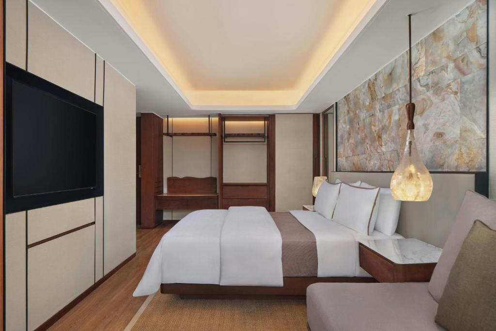 يمكن للضيوف الاستمتاع بتناول المأكولات البحرية المشوية بجانب الشاطئ في مطعم وبار Ikan، في حين يمكنهم تذوق مجموعة مختارة من المأكولات الإيطالية في مطعم Prego، ويقدم مطعم Hamabe الأطباق اليابانية الأصيلة، ويتم تقديم مجموعة فاخرة متنوعة من الأطباق الصينية والهندية وأطباق البحر الأبيض المتوسط والغربية في Seasonal Tastes، كما يمكن للضيوف الاستمتاع أيضاً بأطباق التاباس اللذيذة في Velada Tapas Bar & Kitchen، ويمكن الاستمتاع بمجموعة مختارة من المشروبات المنعشة والوجبات الخفيفة والحلويات في The Lobby Bar & Lounge، فيما يمكن للضيوف أيضاً تذوق بوفيه إفطار صحي يشتمل على قائمة طعام مغذية وجيدة مقابل تكلفة إضافية.