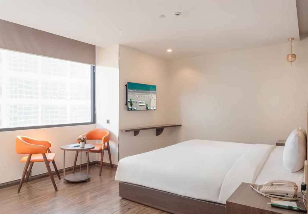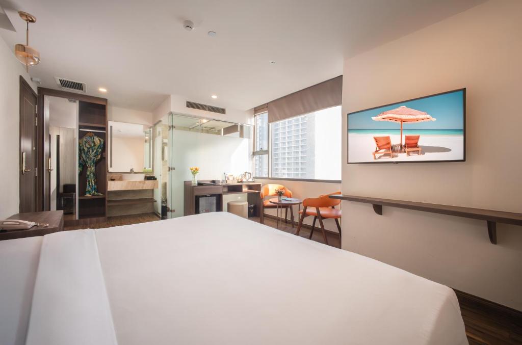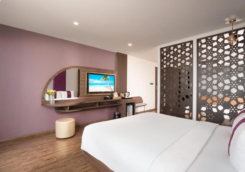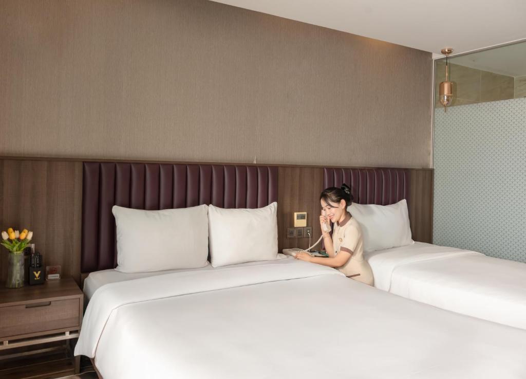 يوفر V Hotel Nha Trang في نها ترانج إمكانية الوصول المباشر على شاطئ البحر وإطلالات خلابة على البحر. يمكن للضيوف الاسترخاء على التراس الشمسي أو الاسترخاء في حمام السباحة الموجود على السطح.